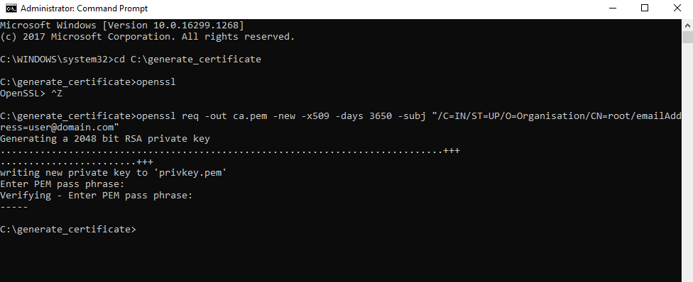 cd <path till the directory> e.g. cd C:\generate_certificate - Execute all the further commands for generation of certificate in this folder.