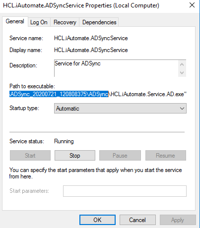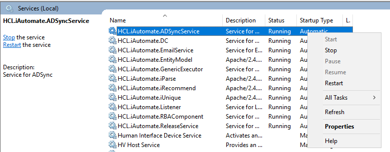 - Search for HCL.iAutomate.ADSyncService and right-click on it.
