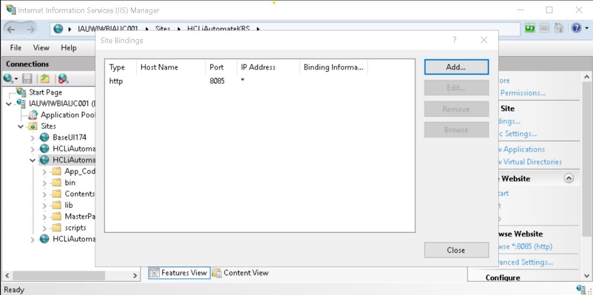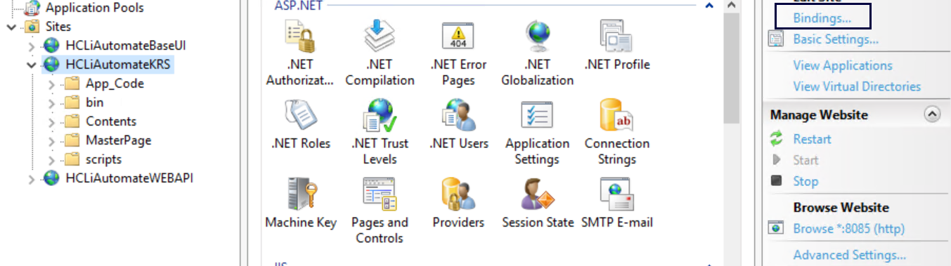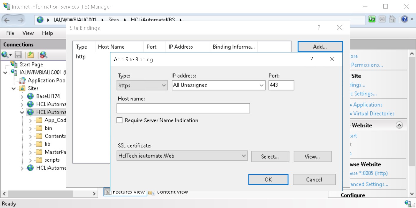 To change the hosting of KRS from HTTP to HTTPS using the existing certificate, for e.g. 'HclTech.iautomate.Web', please follow the below steps:
