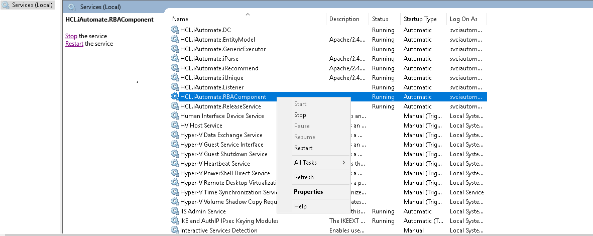 - Search for HCL.iAutomate.RBAComponent service and right-click on it.