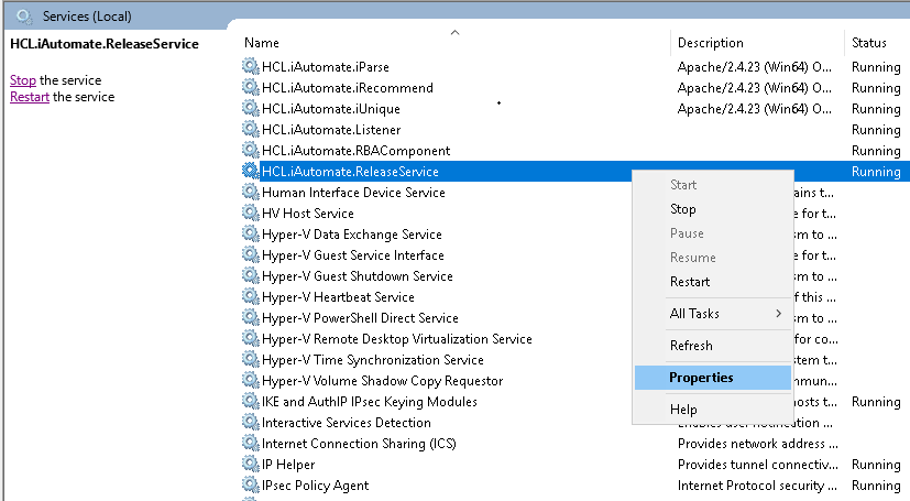 - Search for HCL.iAutomate.ReleaseService service and right-click on it.