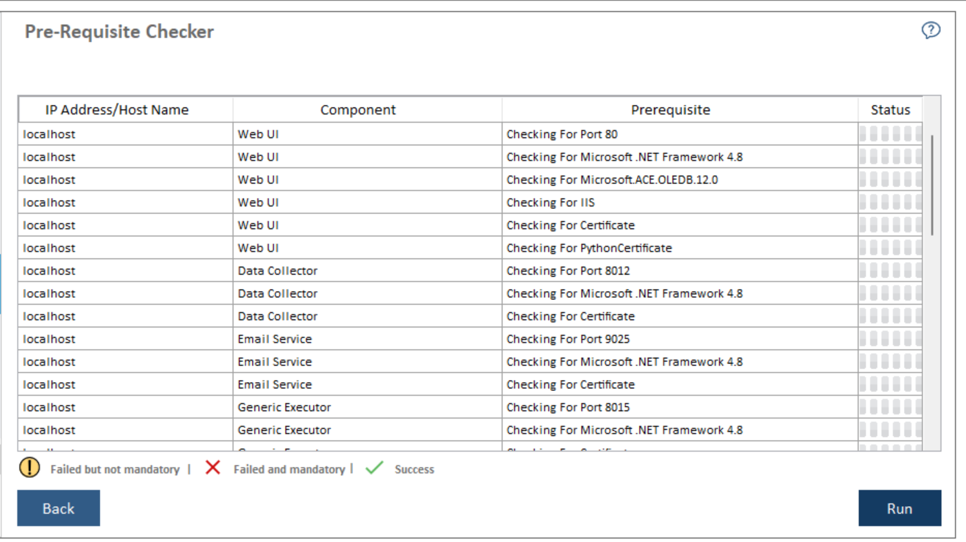 Note:The Pre-requisite Checker always runs as part of the iAutomate setup. - A progress bar appears while the Pre-Requisite Checker runs.