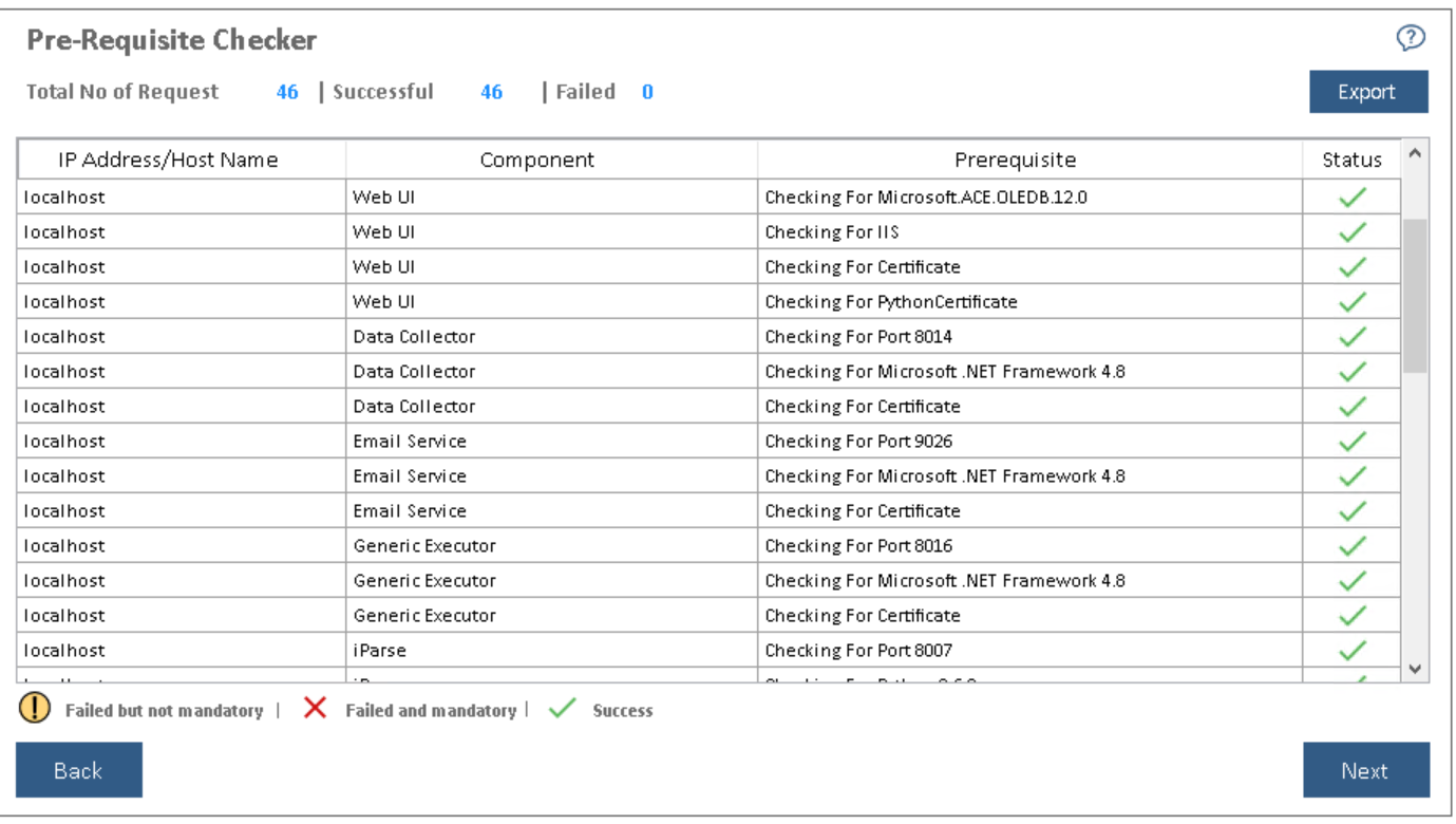 - Click Export to export the Pre-Requisite Checker report, if required.
