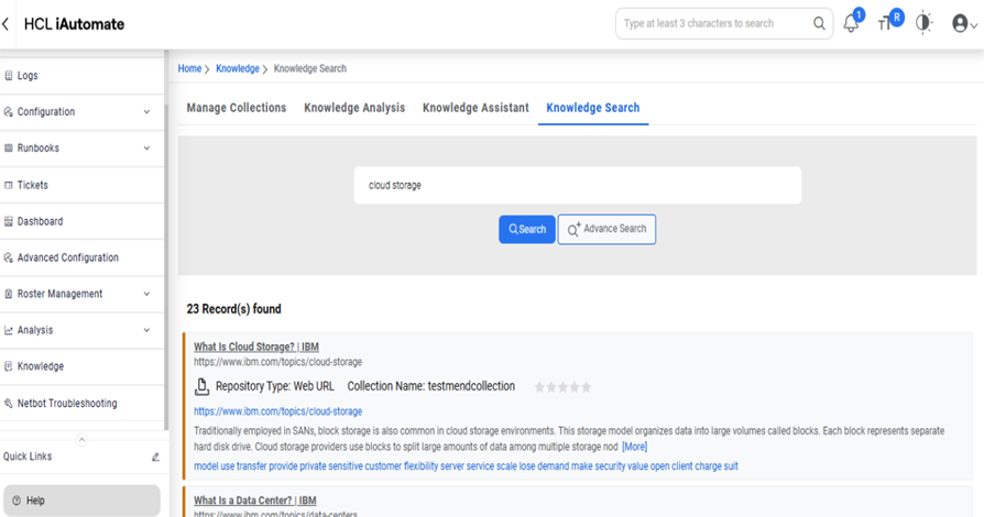 - Knowledge : Enables users to search across the organization’s internal repositories such as SNOW and external domains such as Stack Overflow and Ubuntu.org. Users can also perform an advanced search by applying conditions followed by the search term and Boolean condition (OR, AND, and so on) for more refined results.