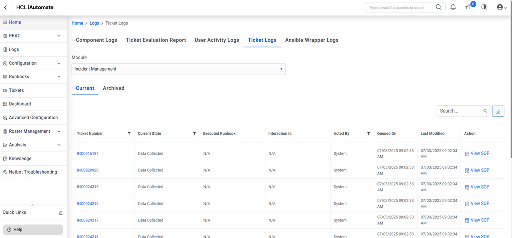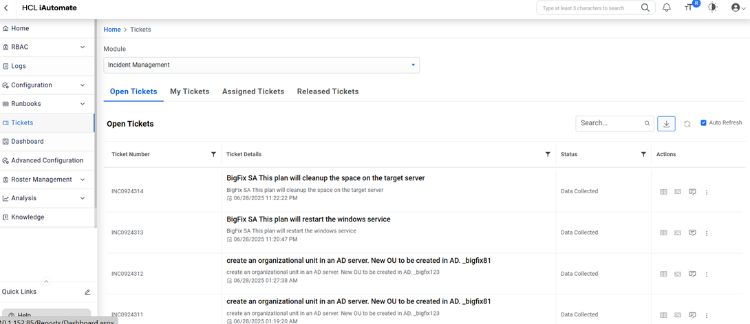 - Tickets: Enables the users to view unresolved tickets and act. Based on confidence score levels, iAutomate can also trigger the executions automatically without any manual intervention.