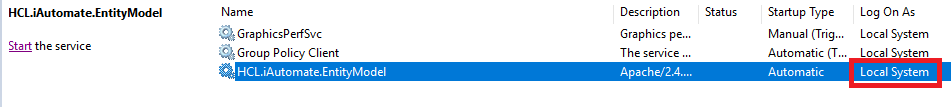 account. Refer to the figure below to check the status.Figure 1. HCL.iAutomate.EntityModel service is not starting