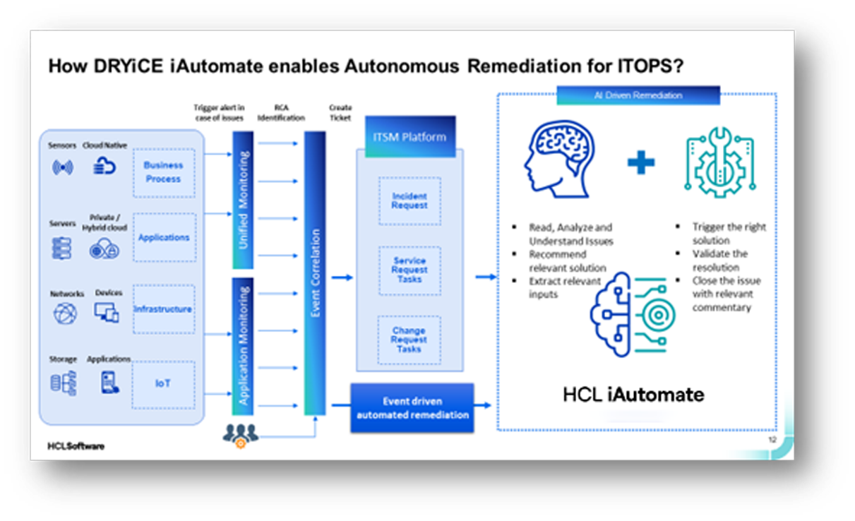 iAutomate is an Intelligent Runbook Automation product which is equipped with Artificial Intelligence, Machine Learning and Natural Language Processing capabilities for simplifying and automating the IT Operations issues resolution lifecycle including incidents, service request tasks, change request tasks and events. It leverages its NLP capabilities for analyzing and understanding the context of a specific issue, recommends the most relevant solution and even triggers the execution, thereby enabling Zero Touch Automated Remediation. It also provides AI-driven Knowledge Recommendation by suggesting relevant knowledge articles from various repositories, both internal and external, as and when required by human agents.