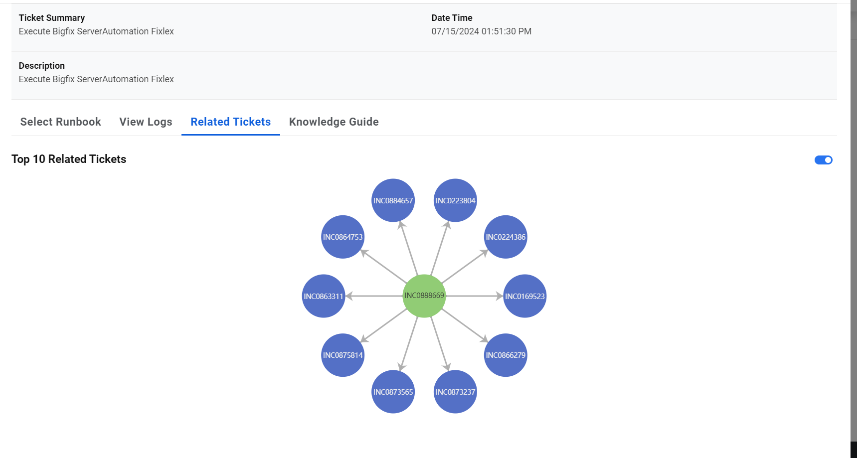 on the popup and below display appears on the screen:Figure 3. Related tickets response from GenAI Studio in graphical mode