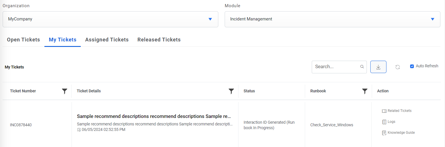 - Users can view all the tickets available in the selected bucket, including their description and the associated runbook details.
