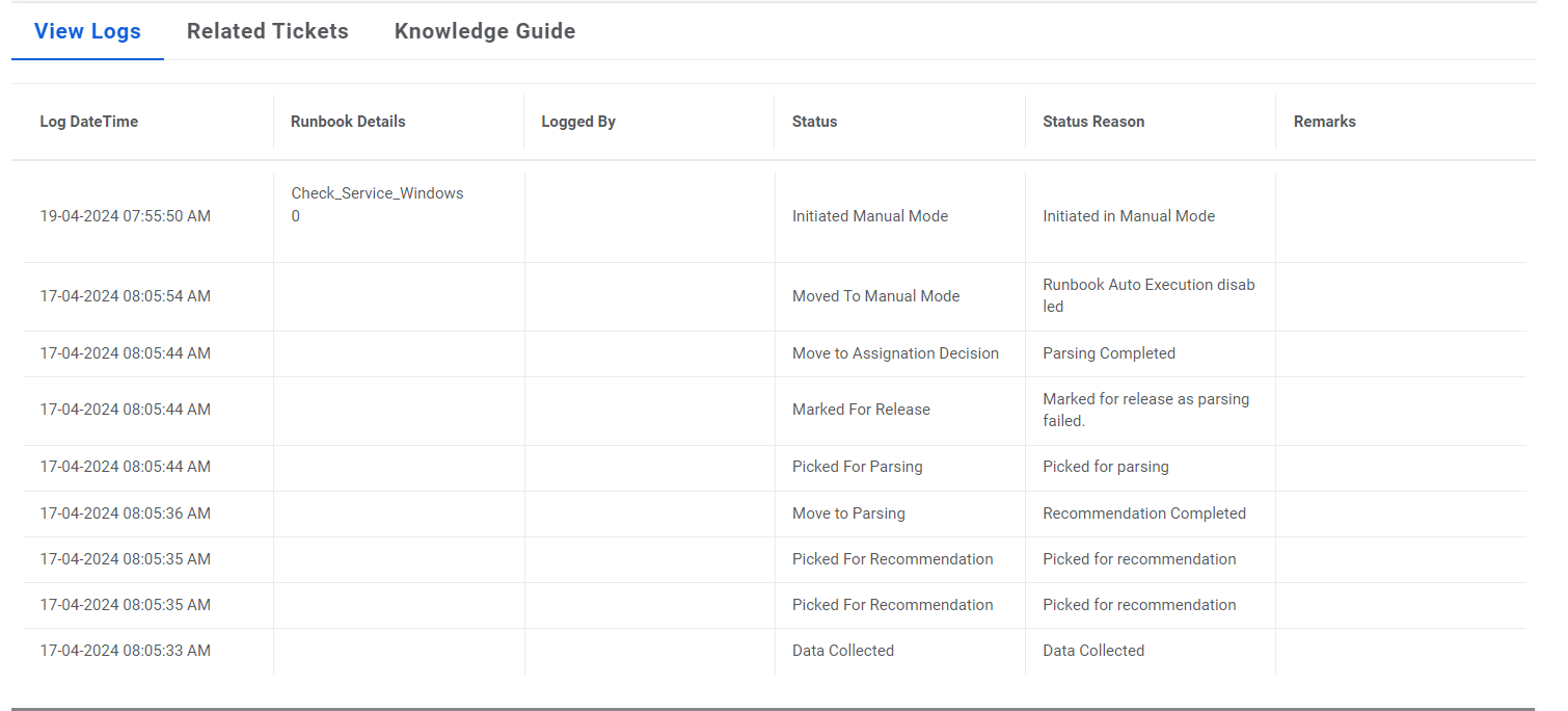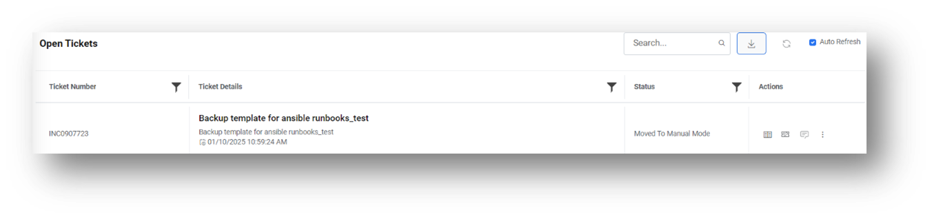 Runbook Execution Status Description Data Collected The data is collected from the ITSM tool. Picked for Recommendation iAutomate recommends the relevant runbook. Move to Parsing On successful recommendation, the system moves the ticket to parsing. Picked for Parsing The system starts parsing the ticket and extracts the required parameters for the runbook. Picked for InProgress This status indicates that iAutomate has started working on the ticket. Move to Assignation Decision The ticket moves for assignments in either auto or manual mode. If auto-mode is enabled for the selected ticket and the confidence score of the runbook is above the threshold, then the ticket is executed automatically. If auto mode is disabled, then the ticket moves for execution manually. Marked for Execution This status indicates that iAutomate has marked in progress and started working on the ticket. Execution Successful and Marked for Closure This status indicates that iAutomate has completed working on the ticket and has marked it for closure. Marked for Release This status means that iAutomate has completed working on the ticket. Figure 1. Open Ticket