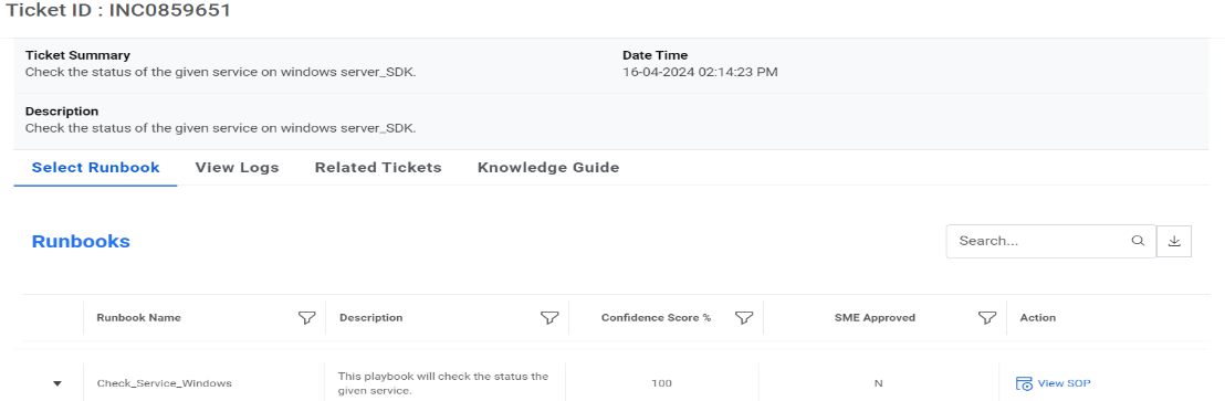 - In addition to the confidence score, the SME Approved column displays the result of SME validation against the runbooks. Both parameters help the user to identify the runbook for execution.