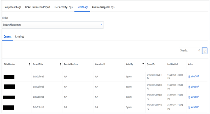 - Current: Lists the log details of the tickets available for execution in the selected organization, including the ticket number, current state, acted by, queued on, and last modified information.