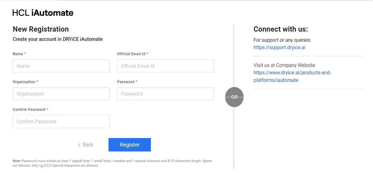 As a first step, the user has to self-register through the iAutomate portal. To do that, perform the following steps:
