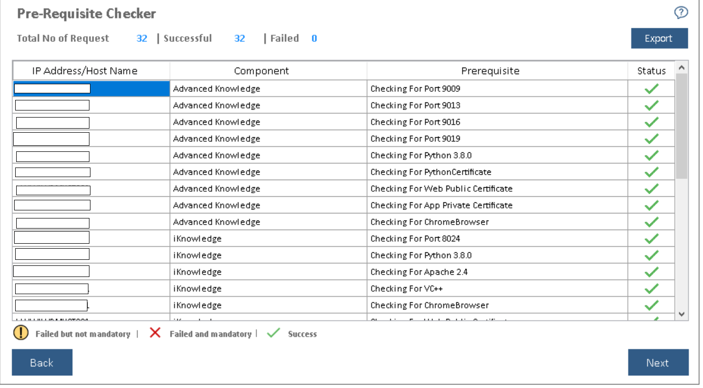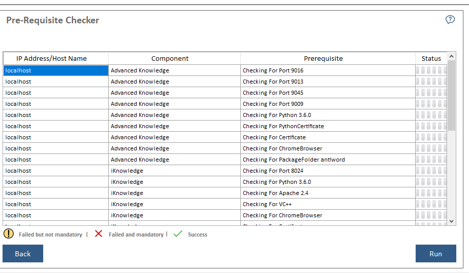 Pre-requisite Checker is responsible for checking if all iAutomate installation pre-requisites have been met before beginning the installation setup. It identifies all the missing pre-requisite software and utilities and highlights to the user. User will have to ensure that the identified pre-requisites are installed before proceeding further.