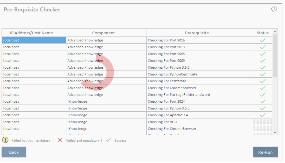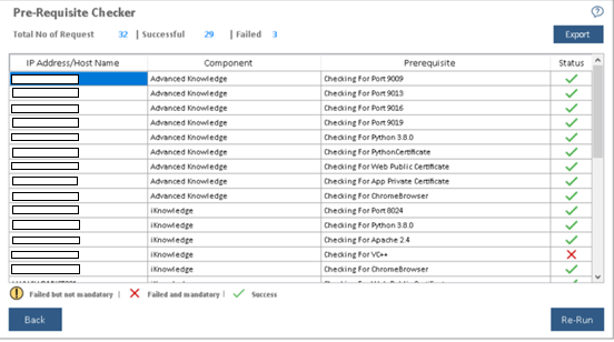 - In case of Failure, Re-Run button appears. Please ensure that the identified issue is resolved and re-run the pre-requisite checker.