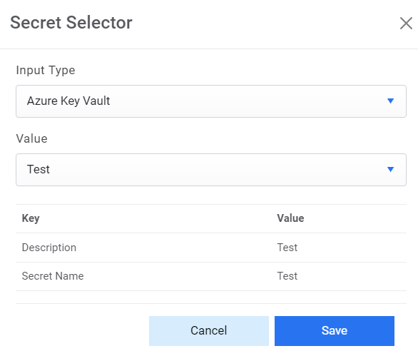 - Password- For password, click on icon next to it. If the password is available in plaintext, then select Input type as Input Text and enter the password in Value field. Else if it is available in Azure Key Vault then select Input Type as Azure Key Vault and then select any of the configured details from the value field. Else if it is available in any Key Vault such as CyberArk then select Input Type as CyberArk and then select any of the configured details from the value field. Else if it is available in Internal Secret Manager then select Input Type as Internal Secret Manager and then select any of the configured details from the value field.