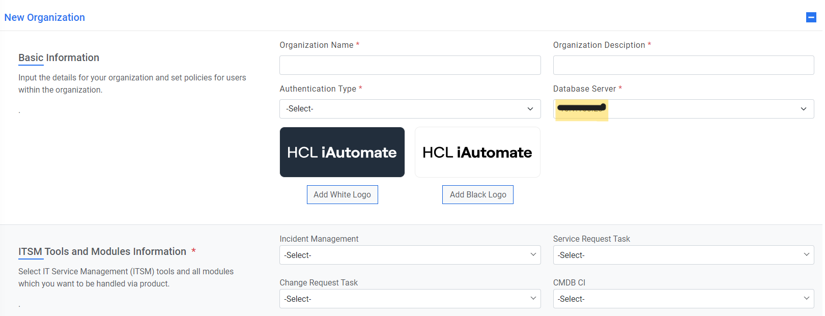 - Go to Actions -> Manage Organizations menu and expand New Organization.