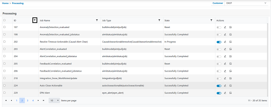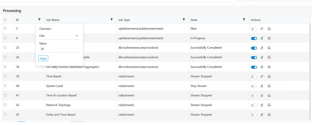 - However, if users require the enabled processing jobs to temporarily stop for some time without deleting the processing jobs, then from this screen the user can disable them temporarily, this will stop the respective processing till it’s enabled again.