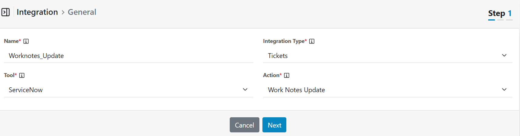 - Click “New Integration” to add integration for Update Work Notes action.