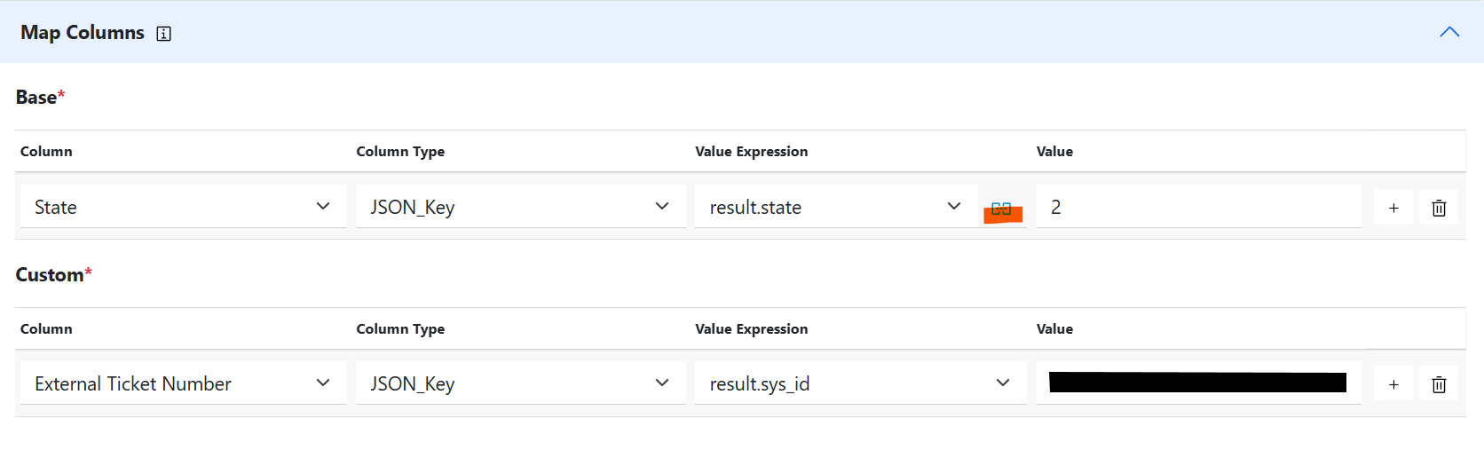 - Click on the “Map Columns” to add new column, click on + button and fill details and value