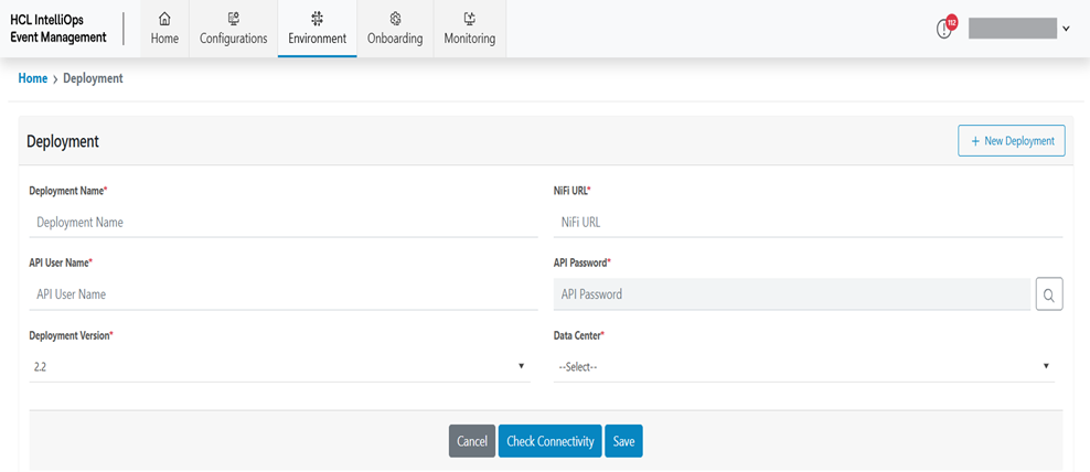 Table 2. Add Deployment Fields Description Deployment Name This field contains the Name of the new Deployment. NiFi URL This field contains the NiFi URL. API Username This field contains the API Username. API Password This field contains the API Password Deployment Version This field contains the current Deployment Version. Data Center This field contains the Data Center List - Enter Deployment Name.