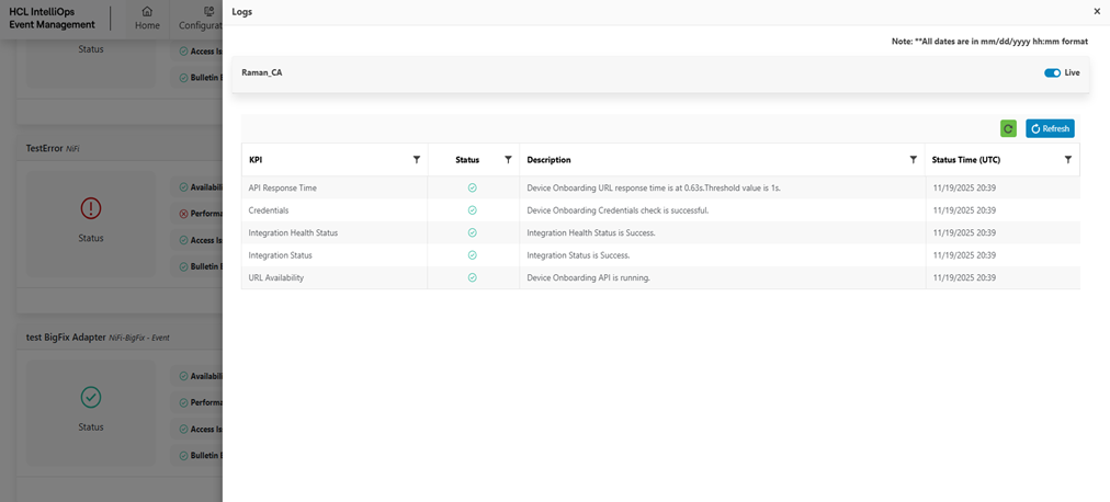 Table 1. View Health Check Logs Field Fields Description KPI Displays the KPI Name. Status Displays the Status Success or Fail. Description Displays the Description. Status Time Display the Status Time.