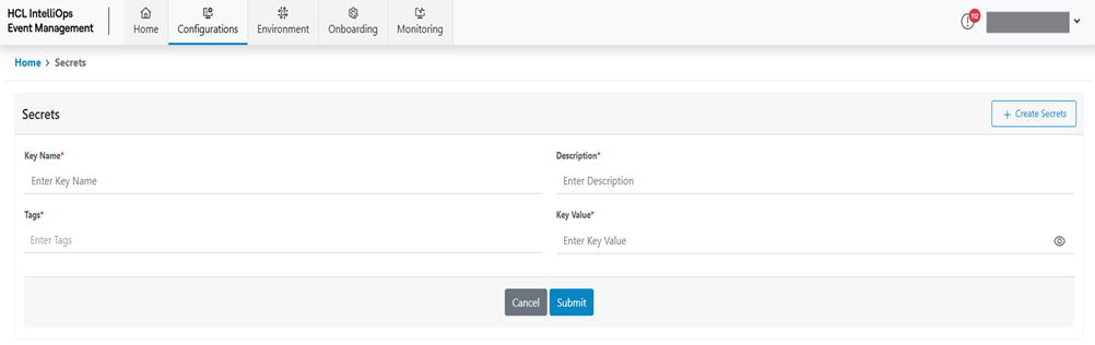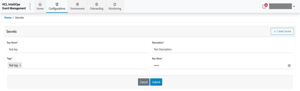Table 1. Create Secret Fields Fields Description Key Name This field contains the Key Name for Secret. Description This field contains the description for Key. Tags This field contains the Tag for key; we can add multiple tag for a Key. Key value This field contains the Value for a Key. - Enter Key name.