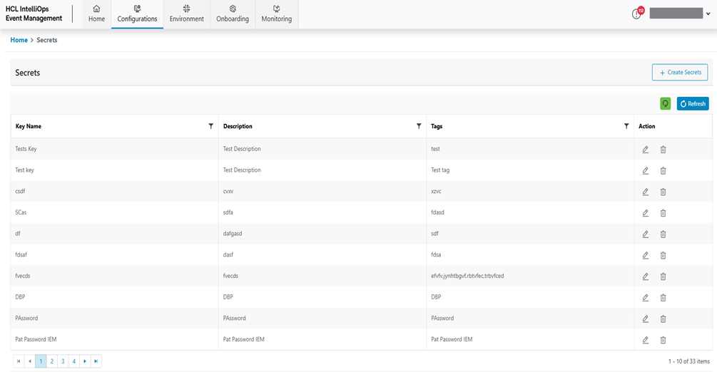- The Secrets screen appears, and it lists the available secrets in a tabular view