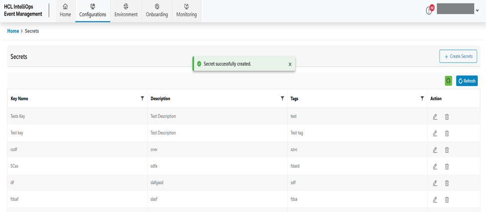 - On the main menu bar, click Configurations then in the sub-menu select Secrets.
