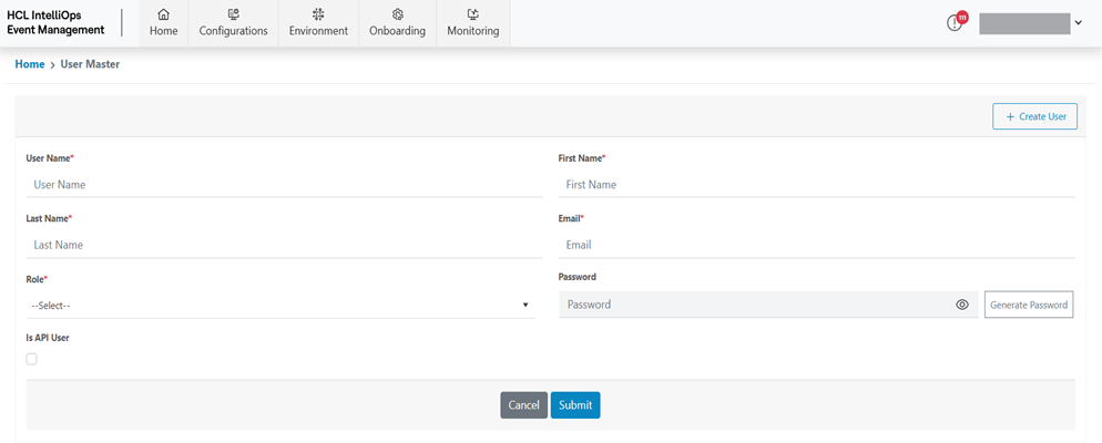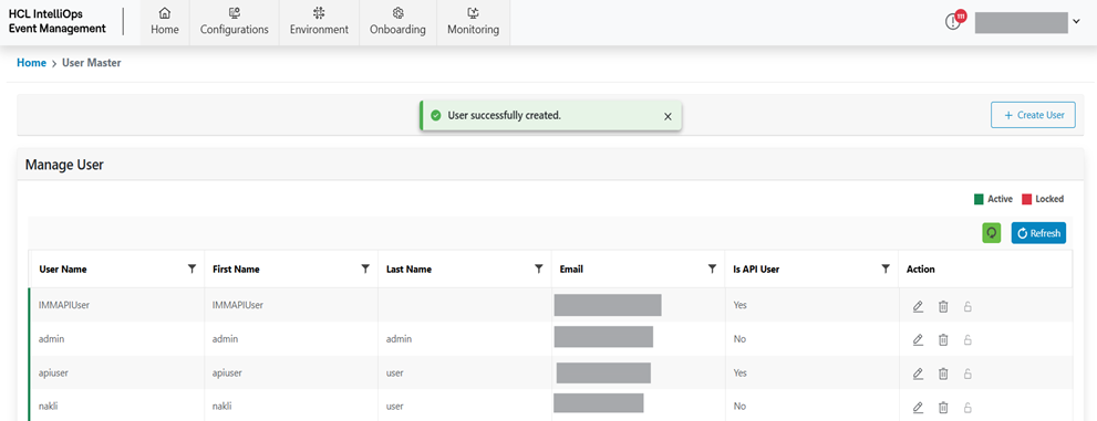 Table 1. User Master Fields Description Username This field indicates the Username. First Name The field indicates the User First name Last Name This field indicates the User Last name Email This field indicates the Email Is API User This field indicates user is API user or normal user Action User to take actions like Edit and Delete against the listed users - It also consists of the following actions: