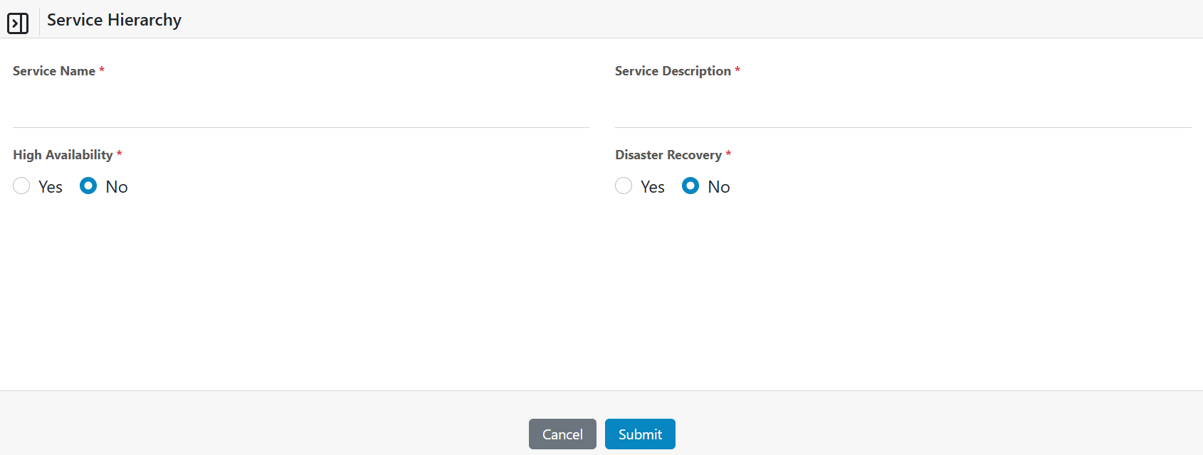- Enter the service name, description and click on the yes or no for the HA (High Availability) and DR (Disaster Recovery).
