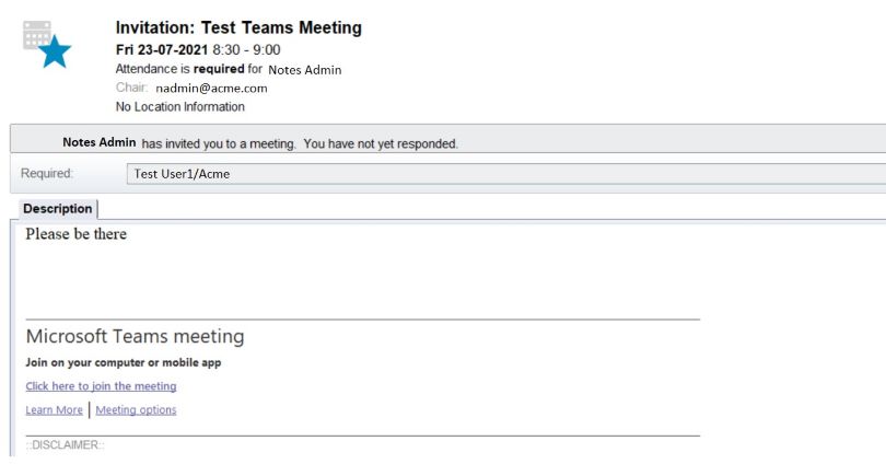 日历改进 Notes 12 提供以下日历功能: 邀请其他用户参加外部邮件用户创建的会议,例如 Outlook 单击邮件邀请内的邀请其他人…以进行选择。有关更多信息,请参阅日历快速参考。注: 此功能需要 mail12.ntf 模板设计。要查看升级后的模板更改,请重新启动 Notes 客户端。 改进了 Microsoft Teams 邀请的呈现。当您单击 Teams 邀请链接时,Notes 会将您重定向到 Microsoft Teams Web 应用程序或应用程序(如果已安装)。 改进了日历界面。有关更多信息,请参阅视觉改进。