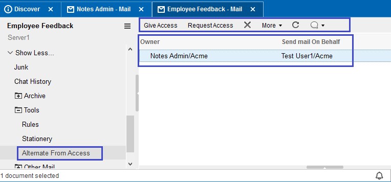Once Enable Alternate From Feature is checked, the "Mail-In Database" tab displays under Preferences. This tab displays detailed information about the shared mail file, as well as provides information on who has the access to that database and what kind of access.