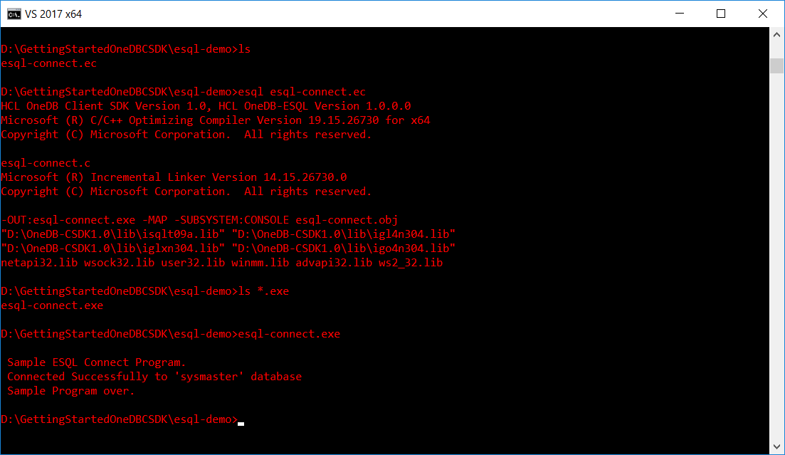 Open “VS2017 Command Prompt” (or later version) window. You can use any text editor to use the below sample ESQL/C code, name it “esql_connect.ec “ and save the file. Run “esql esql-connect.ec” command, it will generate esql-connect.exe executable file. Run this executable file. You should get the SUCCESS message. Refer below image for more information.