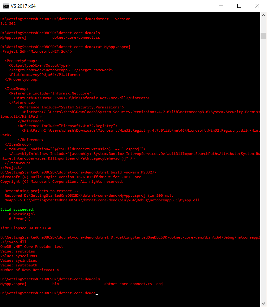 Open “VS2017 Command Prompt” (or later version) window. Below is the sample C# program to use OneDB .NET Core Provider.