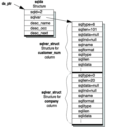 one sqlvar_struct structure for each column.You can use system memory-allocation functions such as malloc() or calloc() and assign the address to sqlvar, as follows:
