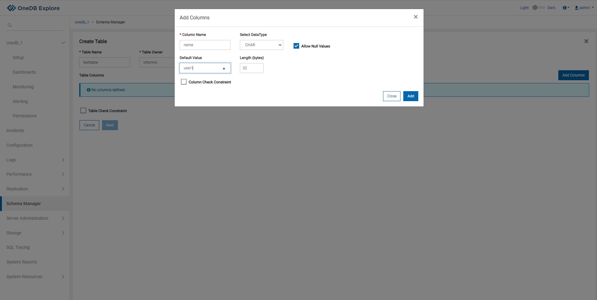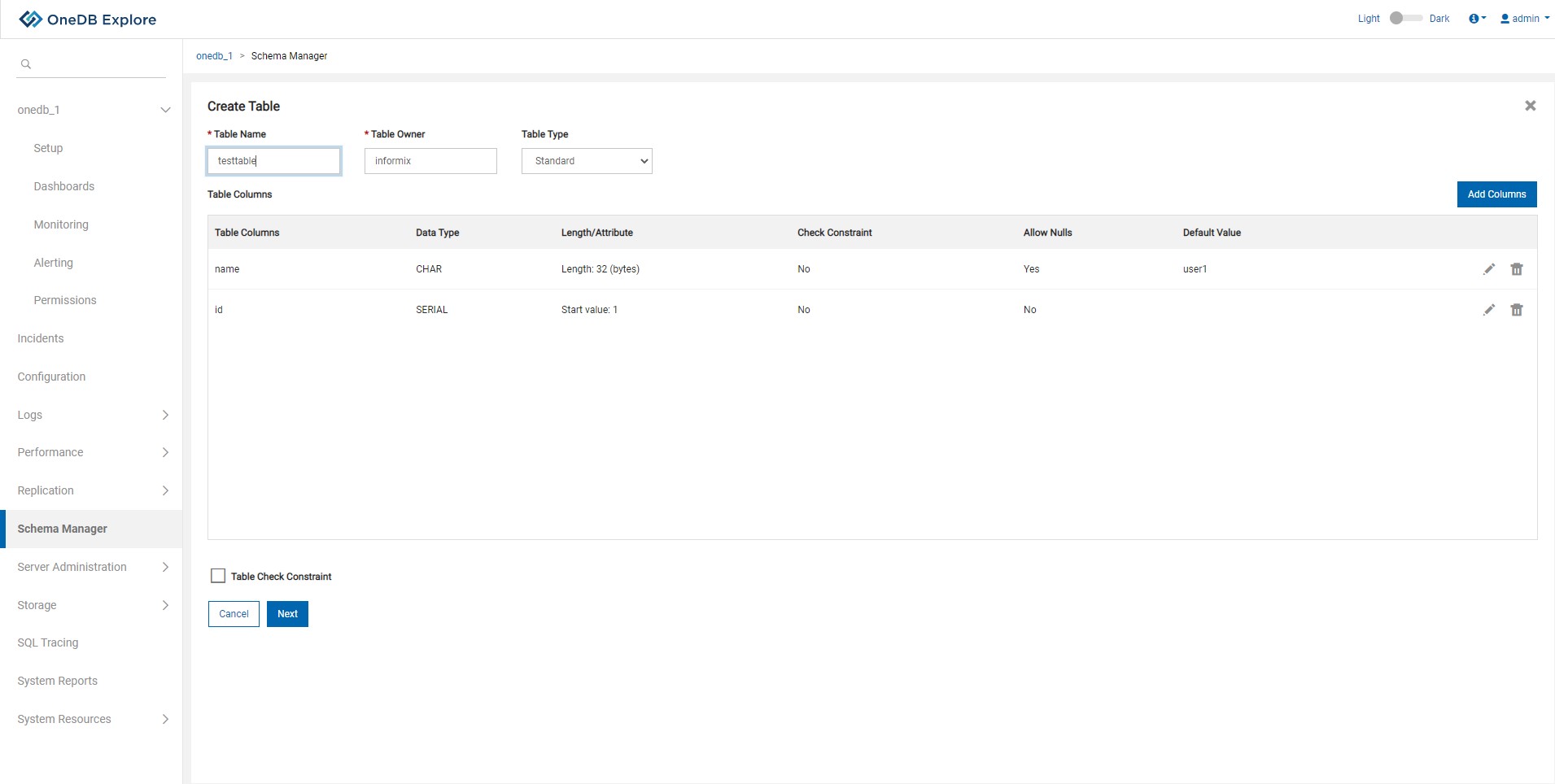- If table is created successfully, information status message will be shown and user will be taken back to Schema Manager page.