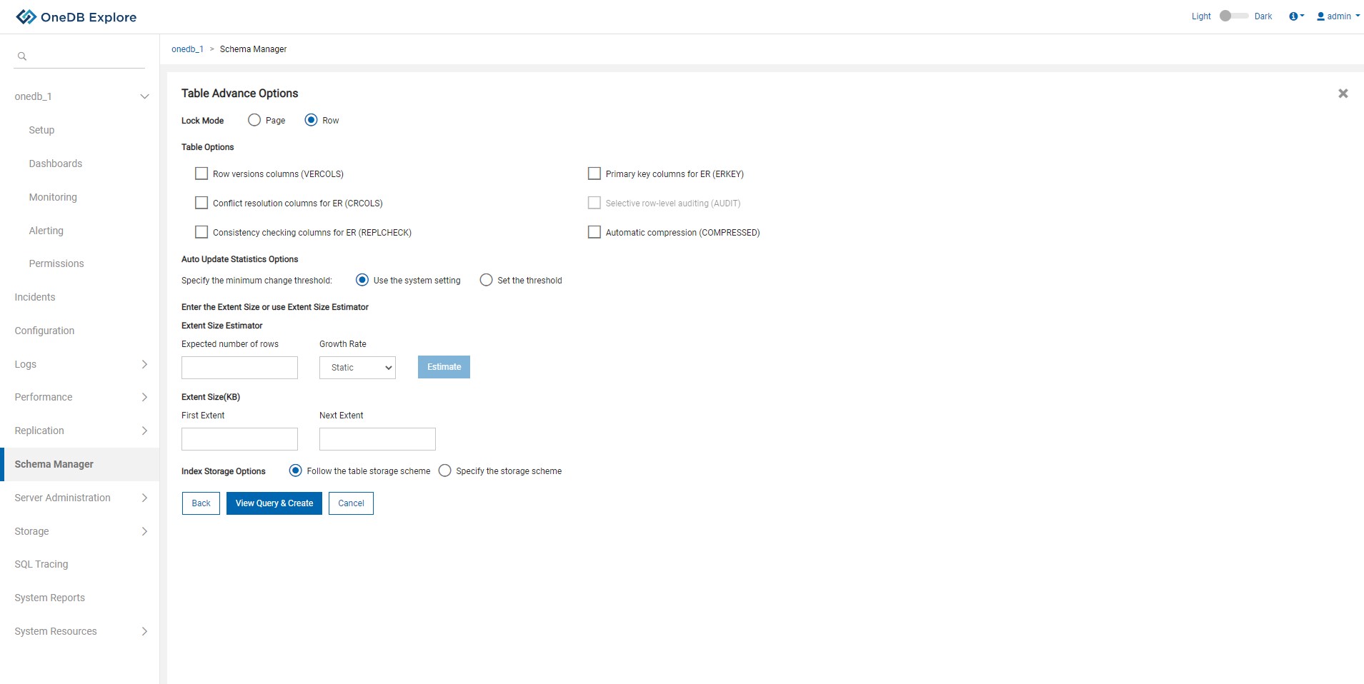 - Once advance table option are set, click on View Query & Create button to view SQL query for creating the table.