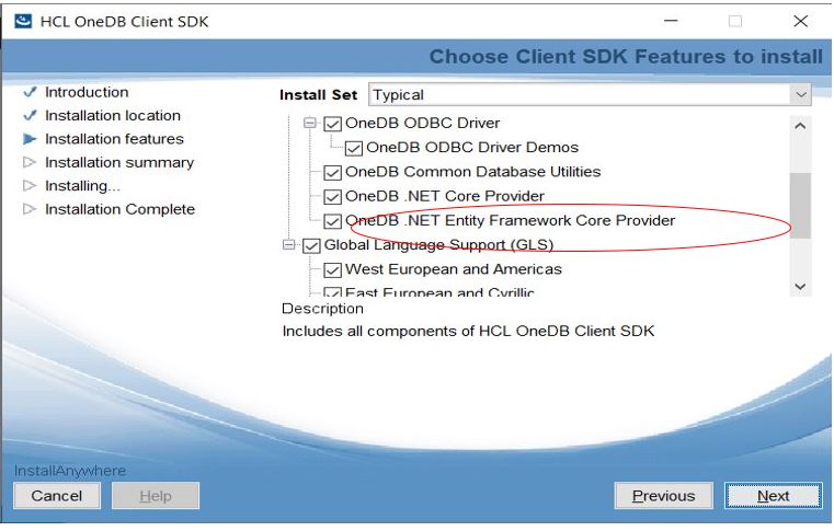 You can install the HCL® OneDB® .NET EF Core Provider with the HCL OneDB Client Software Development Kit (Client SDK) through a typical or custom installation.