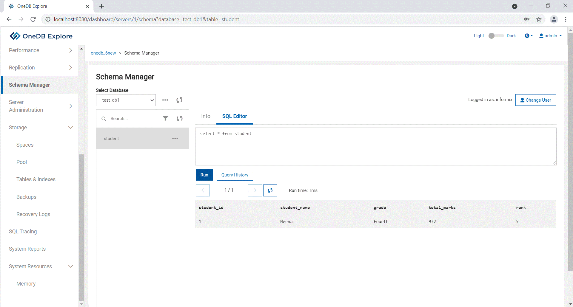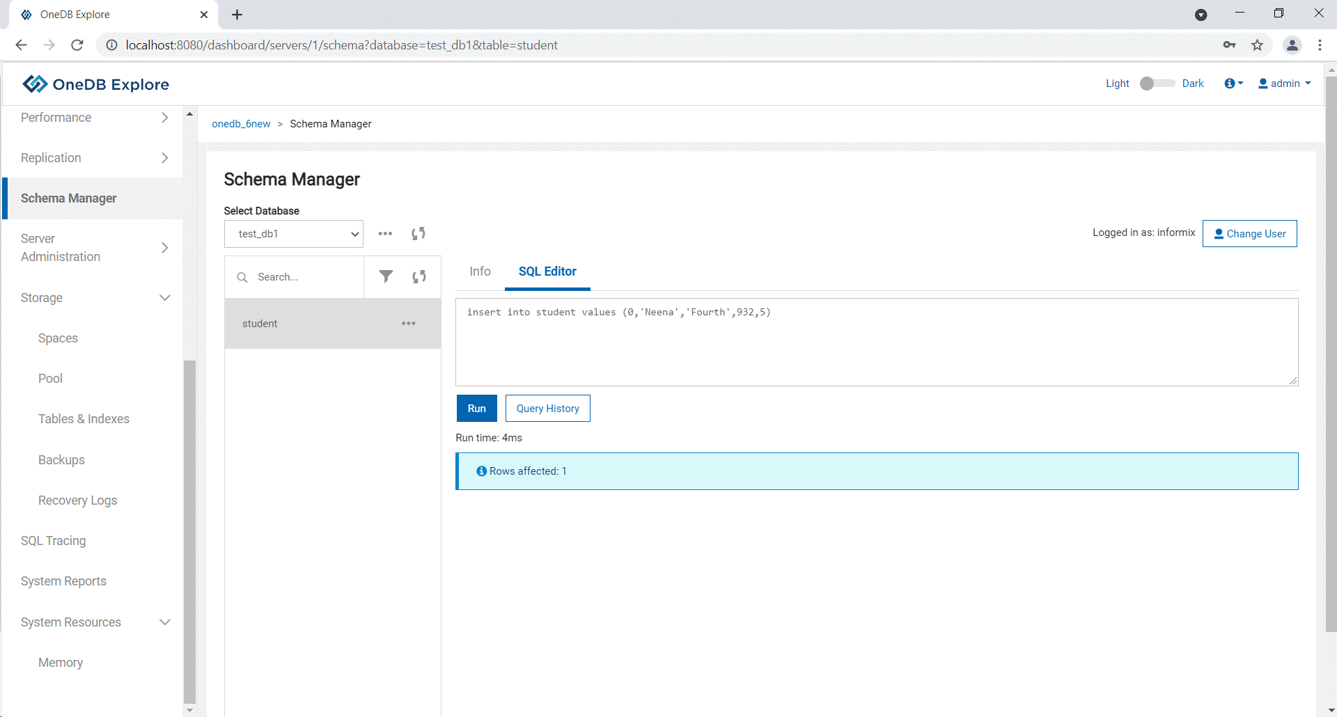Adding a record using OneDB Explore About this taskThis topic provides the steps to create a record. Procedure Select the database from the Select Database drop-down list and select the table for which you want to add a record. Select SQL Editor tab to execute the sql queries.