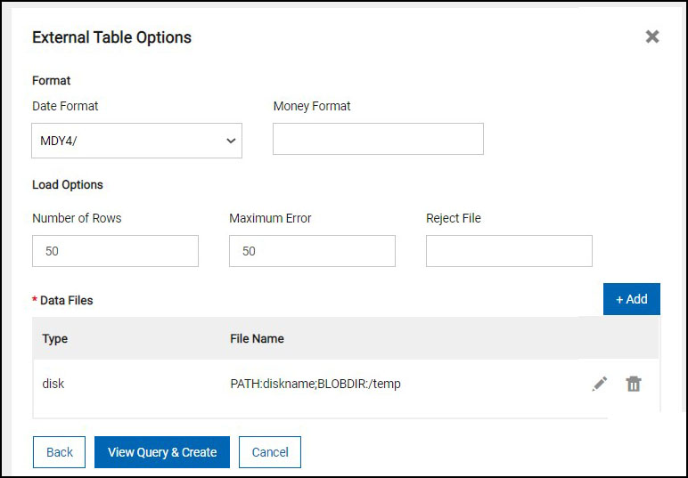 - Once External table options are finalized click on View Query & Create button to view SQL query for creating the table.
