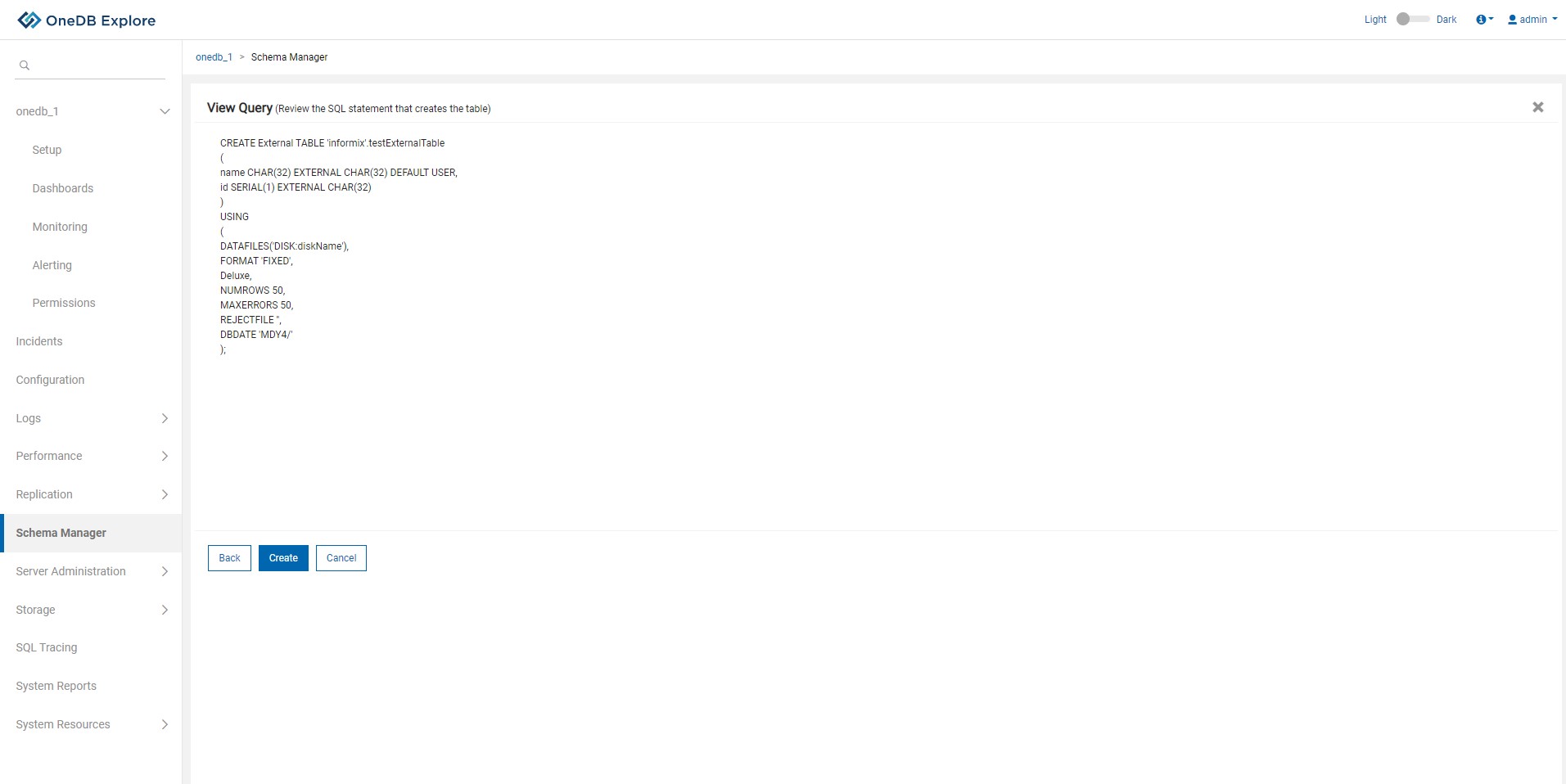 - After clicking on View Query & Create button from the external table option, user will be able to view create table query as shown in the screen below.