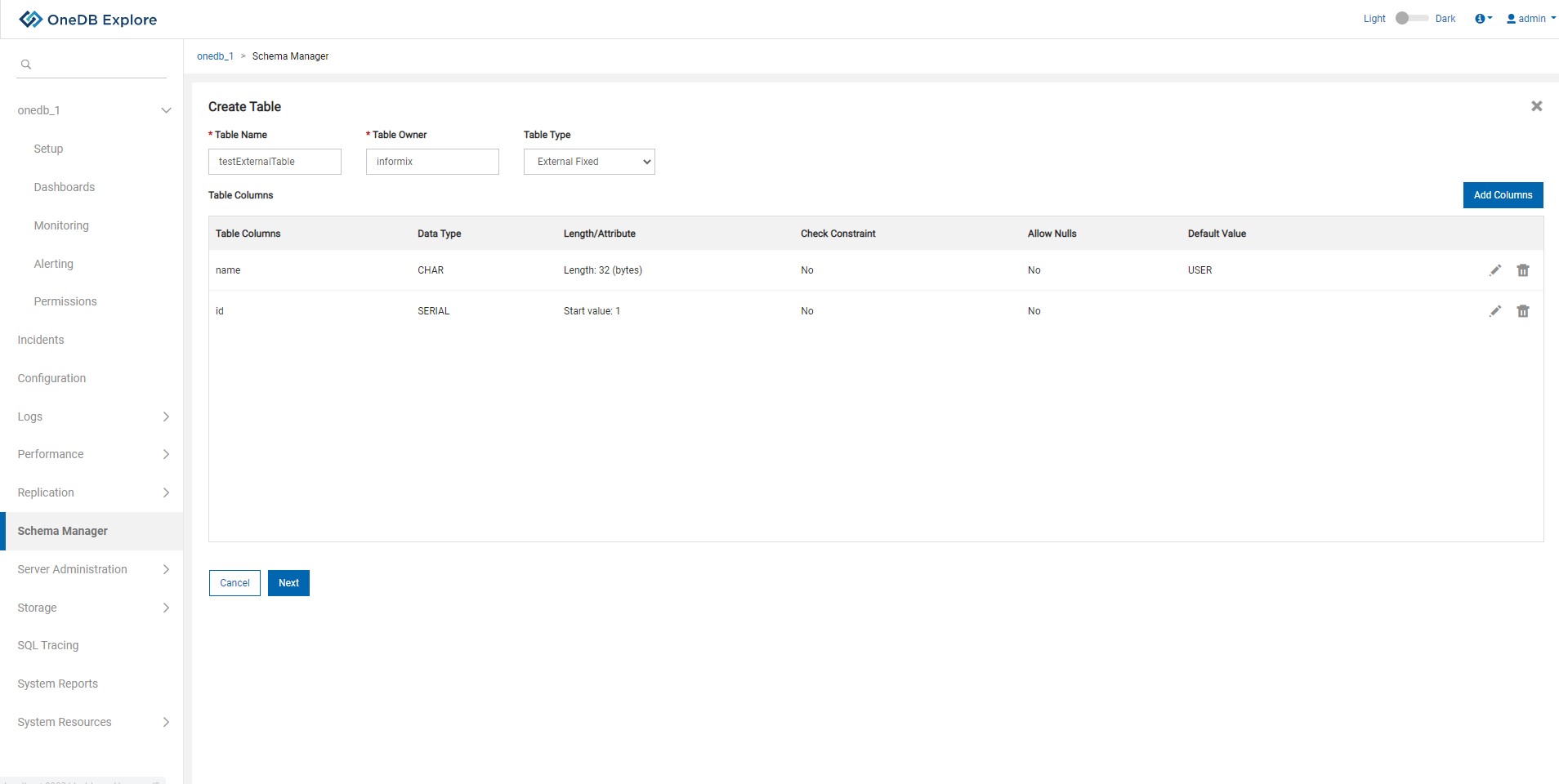 - If table is created successfully information status message will be shown and user will be taken back to Schema Manager page.