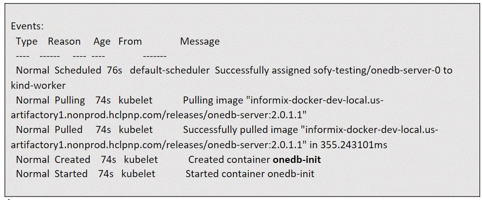 kubectl describe pod onedb-server-1 Once you find the name of the init container, you can run the kubectl exec command and login