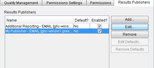 To modify the publication settings of the default publisher, select it and click Edit Defaults (see Results publisher settings for more information).