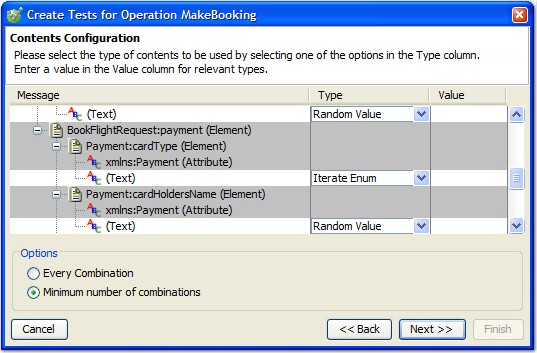 Random Value (Default for all elements, available for all field types) Generates a random value according to the element type. Constant (Available for all field types) Populate the field with the name of the elements parent in reverse. If wanted, this value can be modified. Random Regex (Available for all field types) You can enter a regular expression pattern for the value, and HCL OneTest™ API generates a random value that matches the pattern for every instance of the message field. Boundary (Available for numeric fields) Generates a value that is on the defined boundary of the field. Beyond Boundary (Available for numeric fields) Generates a value that is outside the defined boundary of the field. Iterate Enum (Available for fields with enumerated values) Generate a unique test for each enumeration. - Set the combination options as described in the previous dialog, then click Next.