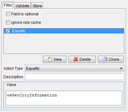 The standard field editor consists of a window with three action groups that are provided under their own tabs: Value, Validate, and Store (for outgoing messages) or Filter, Validate, and Store (for incoming messages).