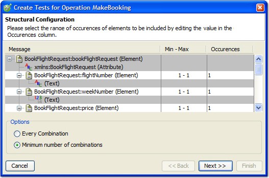 - If Every Combination is selected, a test is created so that every unique combination of occurrences is satisfied (that is, if one element specifies two occurrences and another specifies three, then six tests would be generated).