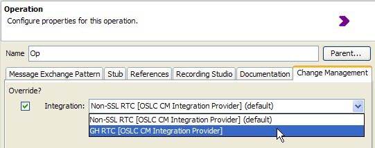 The properties of an operation that you can change are name, parent, message exchange pattern (MEP), stub page, references, Recording Studio color, and the linked OSLC-compliant change management system. The properties are technology-specific. The examples shown are for an HTTP transport. Therefore, the examples are different if you are working with another transport type, such as WebSphere MQ, Oracle Forms, SAP, Java, and so on.