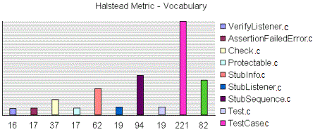 Below the Halstead graph, the Root page displays a metrics summary table, which lists for for the source code component of the selected scope: